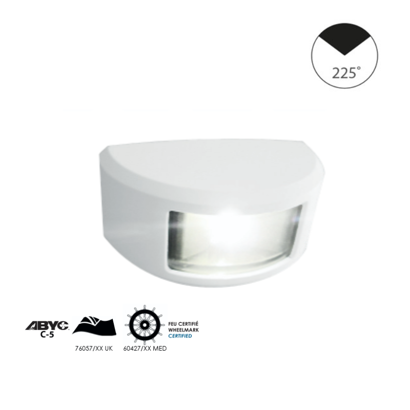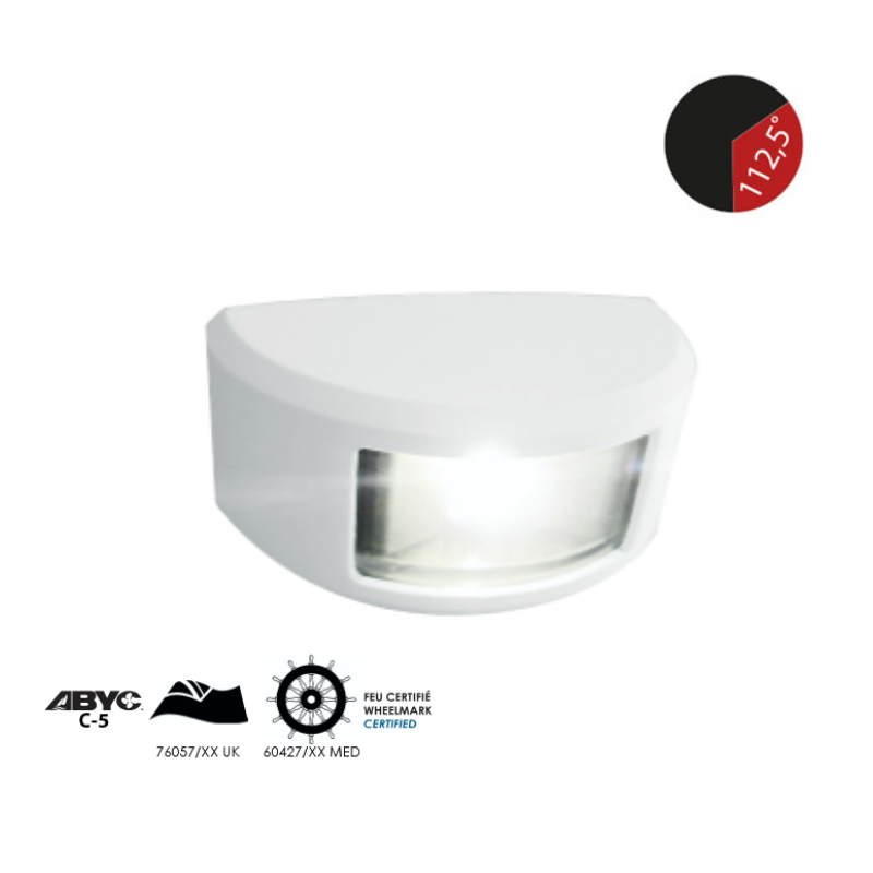 Czerwona lampa nawigacyjna bakburty (lewej strony) w obudowie z białego tworzywa. Przeznaczona do montażu na powierzchni pionowej.