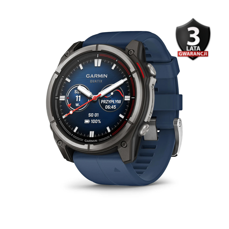 Garmin Quatix 8 AMOLED, to zaawansowany smartwatch klasy marine, stworzony dla żeglarzy i pasjonatów sportów wodnych. Wyposażony w jasny ekran AMOLED, tytanową ramkę i szkło szafirowe, zapewnia wysoką trwałość i czytelność w każdych warunkach. Obsługuje funkcje nawigacyjne, morskie (m.in. sterowanie autopilotem, alarm kotwiczny, dane z łodzi) oraz monitoruje zdrowie i aktywność użytkownika. Wodoodporny do 100 m, z czasem pracy baterii do 29 dni (13 dni w trybie ciągłego włączenia).