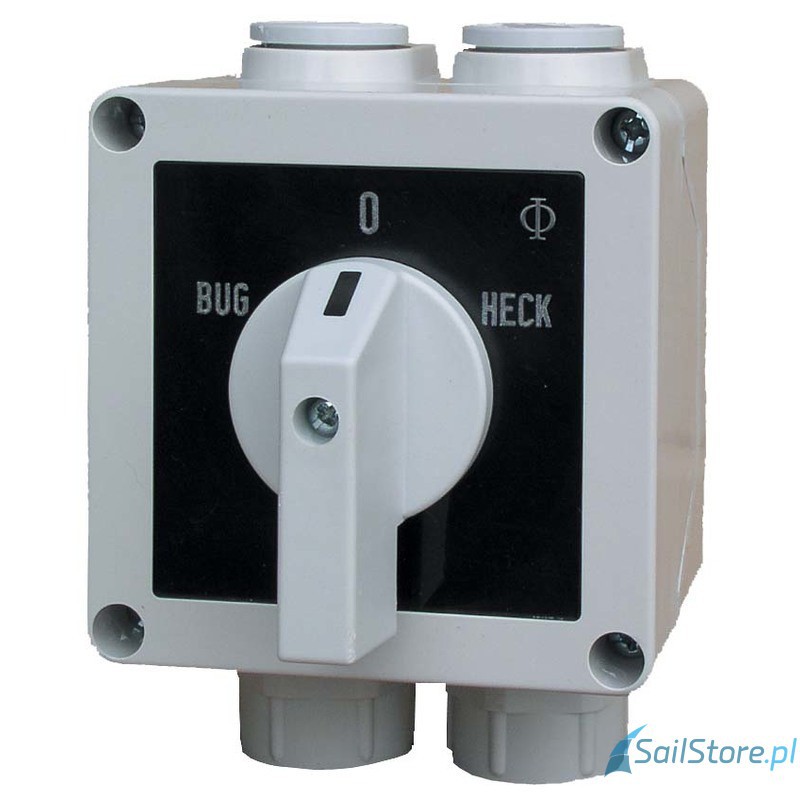 Ręczny przełącznik dziobowo-rufowy do obsługi dwóch przyłączy lądowych o maksymalnym obciążeniu 25 A. Solidna obudowa z klasą ochrony IP X4 zapewnia odporność na warunki wilgotne, co czyni go odpowiednim rozwiązaniem do zastosowań na jednostkach pływających.