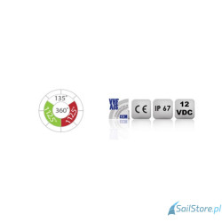 Trójkolorowe światło stałe nawigacyjne z lampą kotwiczną. Emituje światło lewą (czerwoną) i prawą burtę (zieloną) każde pod kątem 112,5° z białymi (rufowymi) światłami 135° oraz kotwiczne białe 360°. Intensywność oświetlenia >5,4cd z diod LED jest widoczna z odległości minimum 2 mil morskich. Cała elektronika została w 100% zalana żywicą epoksydową, co zapewnia pełną ochronę przed wodą, solą, uderzeniami oraz wibracjami.