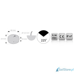 Jednokolorowe światło nawigacyjne emituje światło białe pod kątem 225°. Intensywność oświetlenia >15cd z diod LED jest widoczna z odległości minimum 2 mil morskich. Cała elektronika została w 100% zalana żywicą epoksydową, co zapewnia pełną ochronę przed wodą, solą, uderzeniami oraz wibracjami.