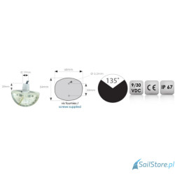 Jednokolorowe światło nawigacyjne emituje światło białe pod kątem 135°. Intensywność oświetlenia >5,4cd z diod LED jest widoczna z odległości minimum 2 mili morskich. Cała elektronika została w 100% zalana żywicą epoksydową, co zapewnia pełną ochronę przed wodą, solą, uderzeniami oraz wibracjami.