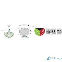 Dwukolorowe światło nawigacyjne emituje światło zielone (prawa burta) i czerwone (lewa burta) pod kątem 112,5°. Intensywność oświetlenia >5,4cd z diod LED jest widoczna z odległości minimum 2 mili morskich. Cała elektronika została w 100% zalana żywicą epoksydową, co zapewnia pełną ochronę przed wodą, solą, uderzeniami oraz wibracjami.