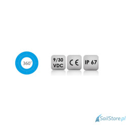 Błyskowa lampa nawigacyjna topowa niebieska 360 stopni, z obudową z czarnego tworzywa. Intensywność oświetlenia >5,4cd z diod LED jest widoczna z odległości minimum 2 mili morskich. Cała elektronika została w 100% zalana żywicą epoksydową, co zapewnia pełną ochronę przed wodą, solą, uderzeniami oraz wibracjami.