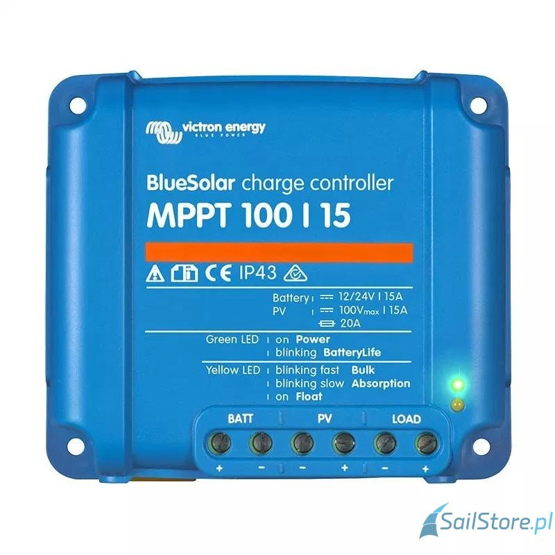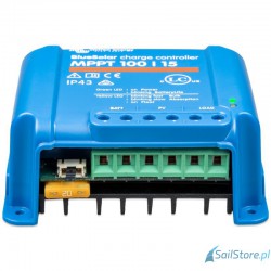 Regulator ładowania Victron Energy ze śledzeniem punktu mocy MPPT, pracujący z napięciem do 100V oraz prądem nie większym niż 15 Amper.