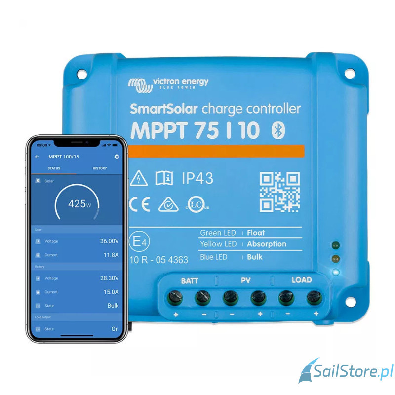 Regulator ładowania 75V/15A. Napięcie 12 lub 24V wybierane automatycznie. Interfejs Bluetooth umożliwia programowanie i monitorowanie za pomocą smartfonu.