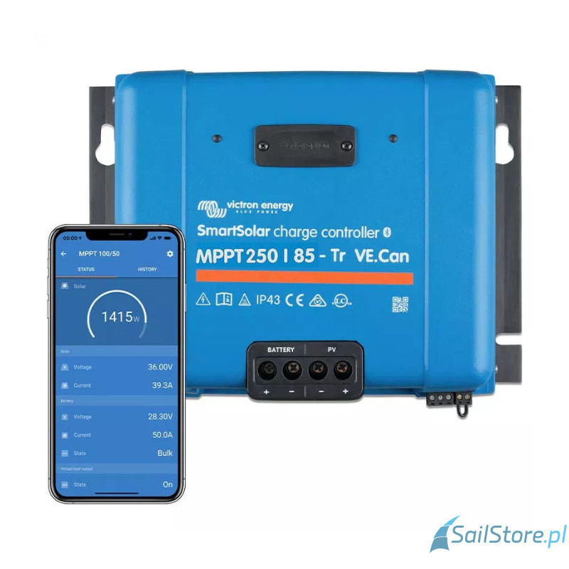 Regulator ładowania 250V 85A. Napięcie 12/24/48V wybierane automatycznie. Interfejs BlueTooth umożliwia programowanie i monitorowanie za pomocą smartfonu. Wyjście CAN.