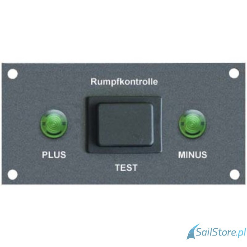 Panel do kontroli potencjału DC na kadłubie. 2-biegunowy przycisk sterujący z dwiema diodami LED. Gdy świecą się obydwie lampki, w kadłubie nie ma napięcia. Wymiary szer. 105 x wys. 52,5 x gł. 70 mm.