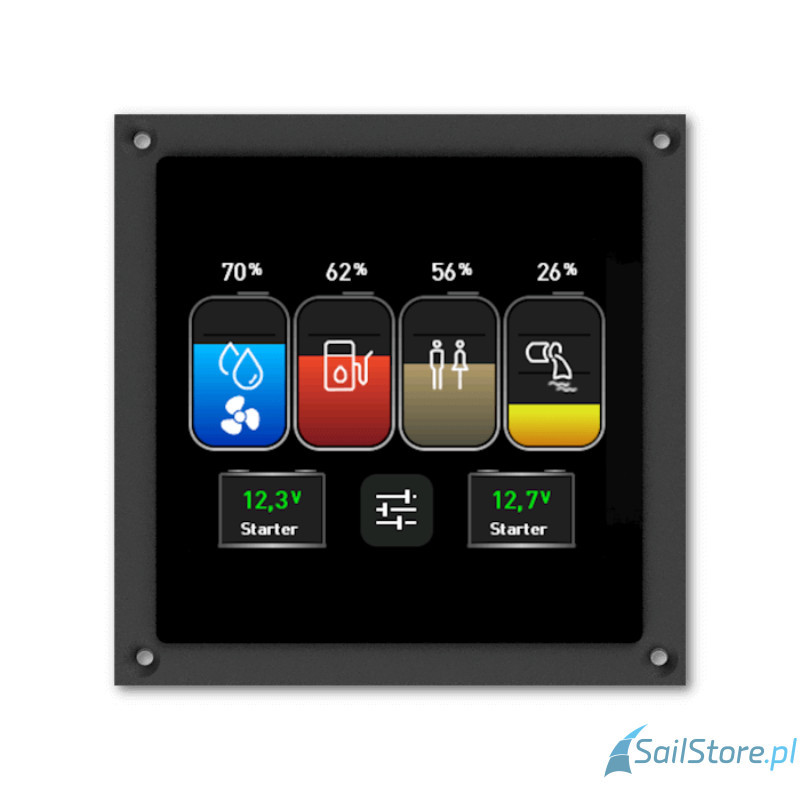 To kompaktowy system monitorowania zbiorników dla jachtów i pojazdów posiadających do 4 zbiorników. Równolegle można monitorować napięcie dwóch grup akumulatorów.