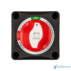 Przełącznik akumulatorowy Battery Switch ON/OFF 275A można stosować w instalacjach akumulatorowych o napięciu do 48 V. Charakteryzuje się unikalną ergonomiczną i estetyczną konstrukcją gałki. Gałkę można zdemontować celem zapewnienia izolacji lub zwiększenia bezpieczeństwa. Przełącznik akumulatorowy można zamontować powierzchniowo lub wbudować w panel sterowania, co zapewnia większą elastyczność podczas montażu. Przełącznik akumulatorowy spełnia wymagania normy ISO8846 Ochrona przed zapłonem, i można go stosować w maszynowniach łodzi.